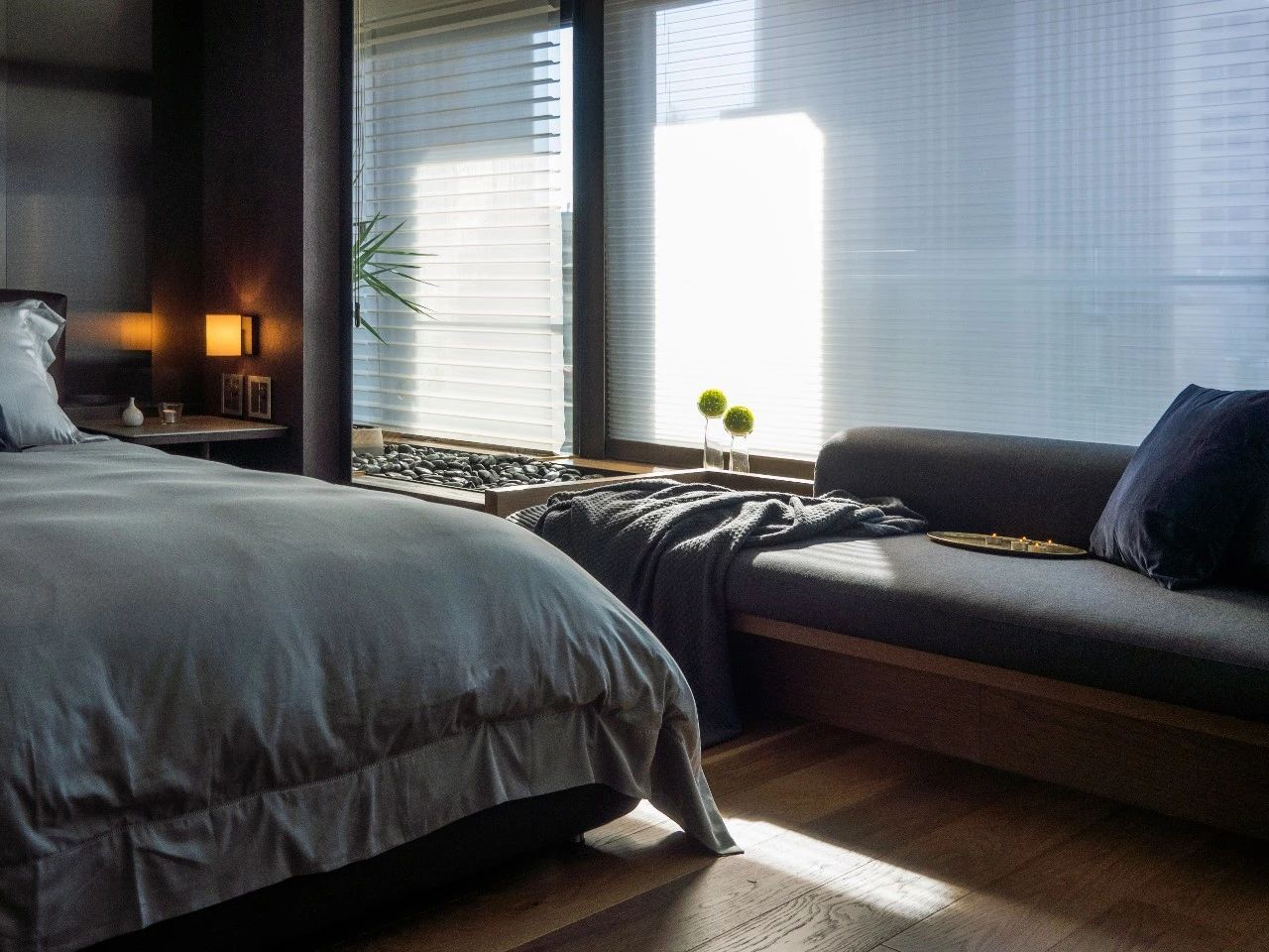 在窗边,恰到好处的绿色静静绽放,无声而强烈的生命力,透过全透玻璃引入主卧。主卧室设计采用石砖电视墙,同样来自于RAYSONIC高拟真度石纹板材,正对着床头的层次镀钛,同样平静却有不同重量。