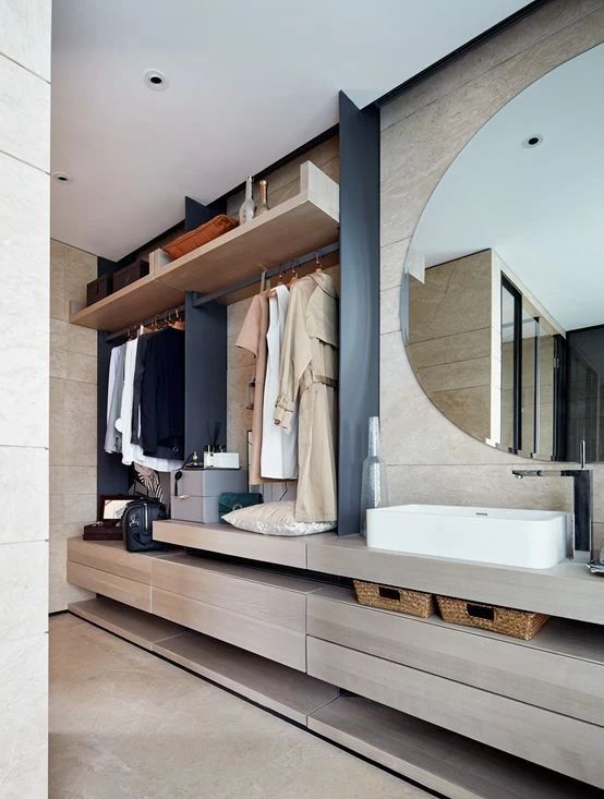半开放式的主卫兼具不同的动线。靠近卧室的一面隔断预留门洞,打开推拉门即可直接从卧室步入卫浴间,进而深入到步入式衣帽间,大大缩短了动线,为主人日常起居提供便利。