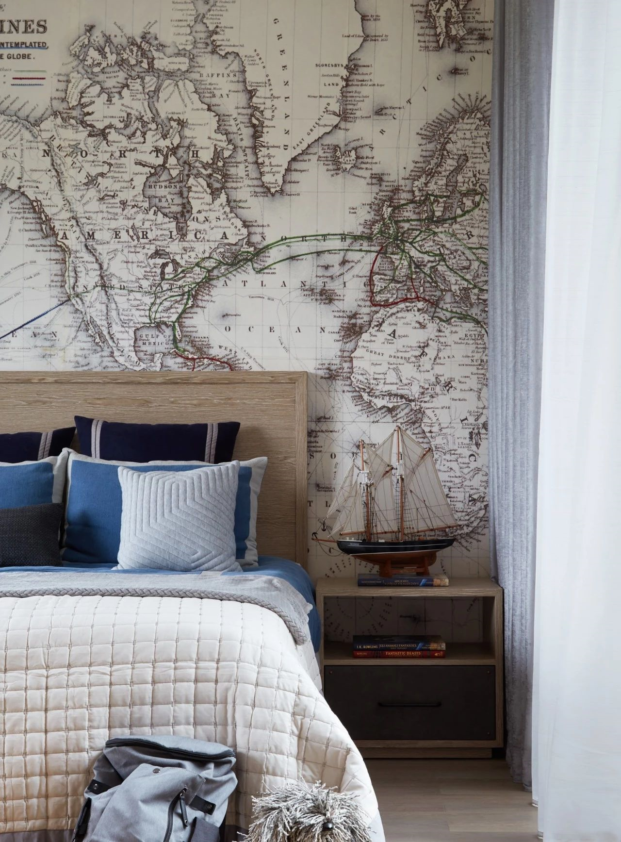 二楼长廊左右设有长辈房和儿童房,明亮的玻璃窗与餐厅视线交互,带来与客厅家人互动的乐趣。卧室采用温和的材质,散发宁静的气息。男孩房的飘窗区域增加收纳功能,圆形的造型与世界地图相辅相成,像望远镜的形状,远眺窗外葱茏的世界。