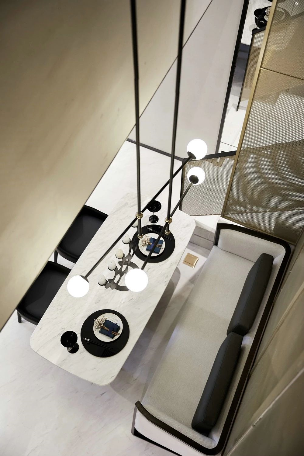 每一种材质都有着自己特有的肌理、色彩和节奏,之间潜藏的色调深度层次,让空间充满动态感。发挥结构构成本身的形式美,以黑白灰主导了一场思维的立体结构和多维度的空间概念。