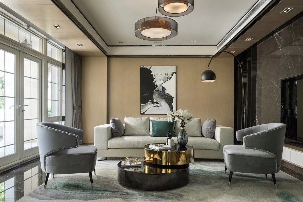 陶瓷、玻璃器物、山水意境挂画摆饰、取意灵动水光的灯饰与地毯、湖蓝搭配深棕的单椅,为精英阶层生活营造一个安静闲适的精神境域。