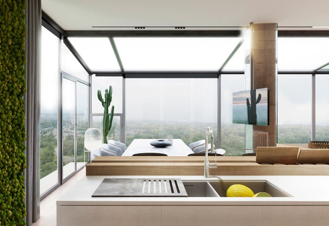设计师打通了厨房和客厅,并在原有基础上增加了露台区域,让整体空间都被360°的景色所环绕,倾斜的露台顶部利于雨水的倾斜,在一定程度上避免了阳光直射。