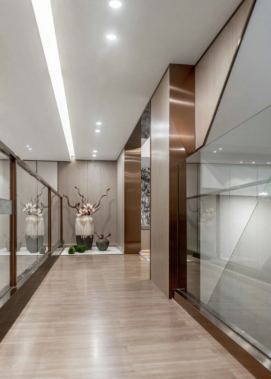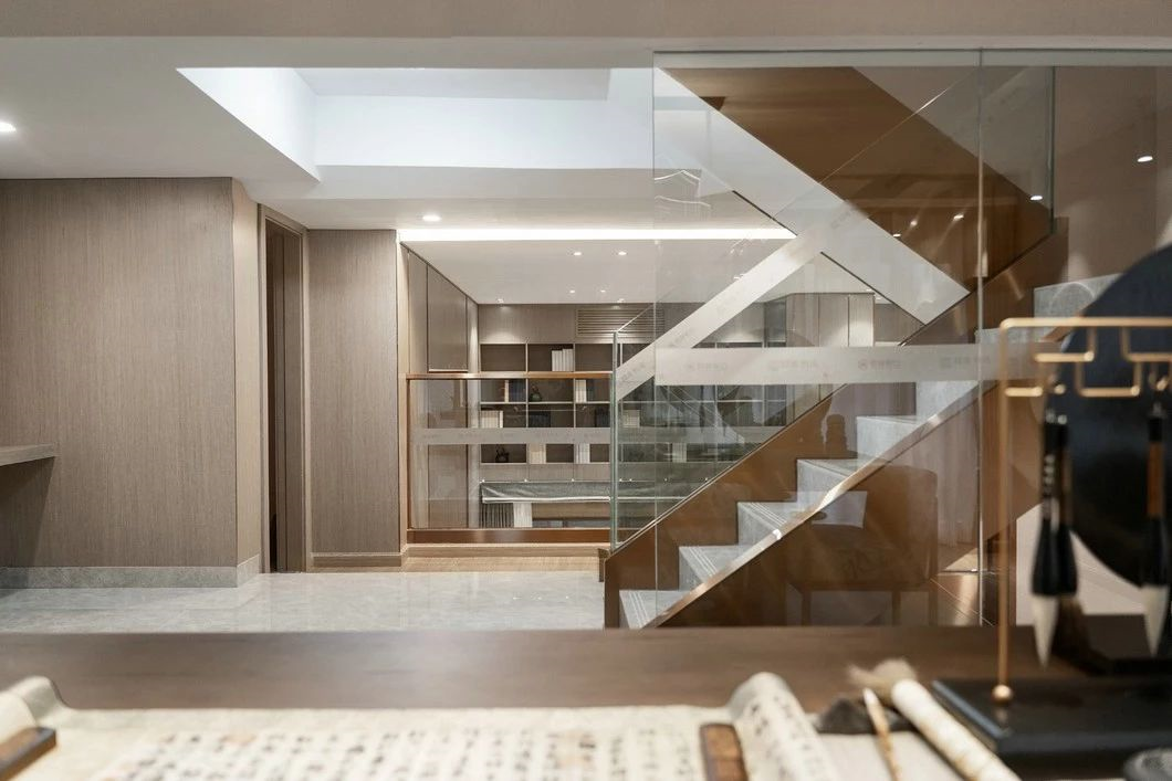 浓郁的高雅感营造出精致的空间,明暗色调和谐共处,其中点缀的少许亮色是点睛之笔。环顾四周之时,软装的搭配相得益彰,电视背景墙水墨质玉石的辉煌感更使整个空间大放异彩,是吸睛之处。 将隔墙打断,转换为屏风,巧妙的把客厅与楼梯连接为一个整体,扩大视觉的延伸性,统一性的风格也因这盏屏风引向二层,逐步扩散到所有空间。 风格上提取中式文化的精髓,再注入现代生活的气息,通过空间的营造,传递一种低调奢华,简约贵气的美感。 顶部直射下的灯光增添了墙壁通透空灵的质感,水墨般的地面涤荡在脚下,一步一涟漪。恰到好处的挂画同空间整体色调相辉映,踏上高地的转折处也藏匿美景,如同人生的旅途。 天花九曲回环,充满极简的艺术感,柔和的线条向前延伸,原点重叠上终点,最终也只记得住那暖到心底的柔光。 有限的留白,无限的创意。在整个空间,人造光、自然光与白无缝融合,凝结成让人停驻的景,艺术与生活共生。 餐厅使用木色桌椅,质感十足。半透明窗纱渗出柔和光线,墙面造型虚实缥幻,折射出的剪影也为白墙添上一抹迷幻色彩。 通透的长条走廊,满铺海浪灰大理石,萦萦绕绕,缠缠绵绵。 空间彼此相融相合,次第展开,没有一处突兀。卧室一侧整面的落地窗,光线透过窗纱洒在地板、床铺,轻盈美好。是内心深处所渴望的理想栖居场所。 通往茶室的艺术长廊质感十足,满溢现代气息,墙身的挂画也延续了先前的风格,仿若置身艺术殿堂,踏足到哪里都伴随着雅气。 利用负一层打造地下茶室,布局优化,空间利率最大化。顶部开天窗,光线倾泻而下,置身其中,恍若白昼。 静谧幽清,悟禅解意,感受繁华都市内难觅的安宁和历久弥新的气韵,风格上恰如其分的融入现代气息,不突兀,不违和,仿佛天生就该同俱一体。 佛曰:“一方一净土,一念一清净。” 纷扰都市内体悟禅的意境,空间内外,尽避于喧嚣之外,以古为意,一盏清茶慰一方净土。 徘徊在古意与现代之间,静心沉气,品一壶清茶,立一盏红梅,随意中增添几分情趣,洒脱中再添万丈柔情。