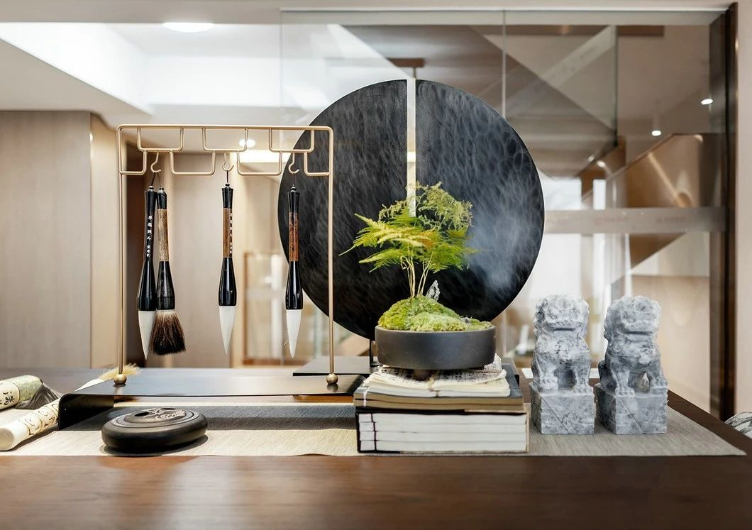 在空间中,设计以东方古典的形式勾勒生活的美学质地,简净的木色,人文情怀浓郁的水墨色,天然的纹理和材质呈现出的质感美,整体空间流泻出沉静淡然的气息。