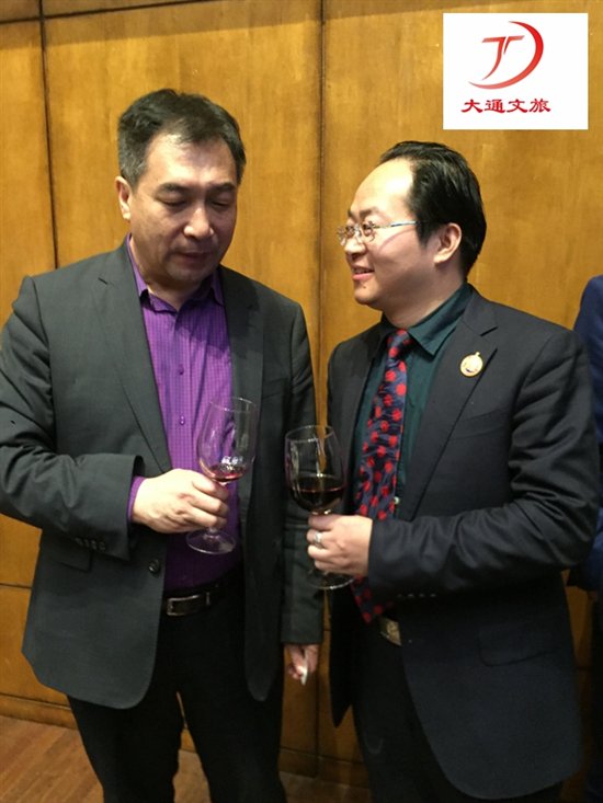 国际阔旗集团董事长顾唤予(图右)与联合国工发组织全球科技创新中心理事长习明龙(图左)把酒交流文旅产业发展