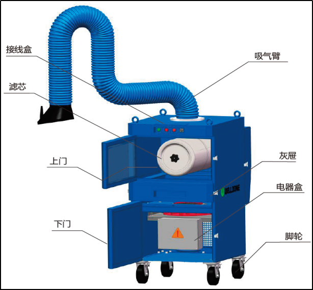 吸气臂安装在机器安装孔处,通过螺栓固定。吸气臂可360度转动任意位置悬停,可将吸尘罩口移动到您所需要的地方,从源头吸收污染源。